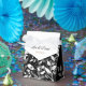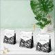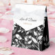 Fabulous tent shaped favour box has a lovely floral pattern in Black and White and a ribbon bow at the top. Shown in Black and White backgrounds and has the newlywed's first names.
