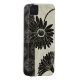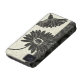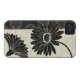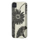 © Daphne Brissonnet / Wild Apple. Three flowers in full bloom, in black and white. The image has a floral patterned background in an off white shade and black on the left side.