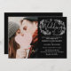 A black and white wedding invitation featuring a delicate hand-drawn rustic floral garland of botanical leaf foliage with stylish script typography. Designed by Thisisnotme©