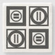 Bold geometric pattern features four black squares with white space between them. The two diagonally opposed thick squares each contain a thin black circle with a thick equal sign inside. In contrast, the two thin squares each contain a thick black circle that touches the square’s edges with a thin vertical equal sign inside.