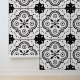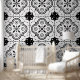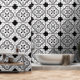 A stylish modern black and white geometric abstract shapes and quatrefoil shaped peel and stick wallpaper wall treatment, to modernise your bath, kitchen, or any room. Perfect when you live in a rental apartment that needs your personal style and touches of design to make things pop. Peel and stick wallpaper is one of the best DIY hacks for apartment dwellers to give them more control over their home decor style! Go wild with patterns and colours. Comes in smooth and textured. Get the textured for bumpy textured walls, and smooth or textured for smooth walls.