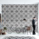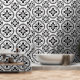 A stylish modern black and white geometric abstract shapes and quatrefoil shaped peel and stick wallpaper wall treatment, to modernise your bath, kitchen, or any room. Perfect when you live in a rental apartment that needs your personal style and touches of design to make things pop. Peel and stick wallpaper is one of the best DIY hacks for apartment dwellers to give them more control over their home decor style! Go wild with patterns and colours. Comes in smooth and textured. Get the textured for bumpy textured walls, and smooth or textured for smooth walls.