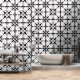 A stylish modern black and white geometric abstract shapes, peel and stick wallpaper wall treatment, to modernise your bath, kitchen, or any room. Perfect when you live in a rental apartment that needs your personal style and touches of design to make things pop. Peel and stick wallpaper is one of the best DIY hacks for apartment dwellers to give them more control over their home decor style! Go wild with patterns and colours. Comes in smooth and textured. Get the textured for bumpy textured walls, and smooth or textured for smooth walls.
