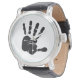 A watch showing a black hand print or palm print on white background. The design is simple and is black and white.