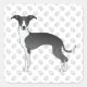 Destei's original cartoon illustration of a black and white coat colour Italian Greyhound breed dog. The background has a pattern of dog paw prints in light grey colour.