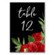 Help your guests find their seats with this elegant red, green, black and white floral table card. The letters and numbers are in a script font, while a red floral arrangement sits below the text.