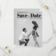 An unusual wedding Save the Date that looks like a black and white magazine cover. It has a black and white photo of a pair of lovers photographed in the moment when the boy proposes to the girl, on his knee; the are seen from profile. In the upper part, the title Save the Date is written in big bold black fonts (except the word "the", that is in script, between two black lines. Above the title and the first line, to the left, there is the date; under the title and the second line, to the right, there is the place; both are also black. To the left of the two lovers, their names are written in white, with the message "Formal invitation to follow" in smaller white fonts under it.