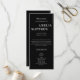 The wedding program design is a model of sophistication with its vertical orientation and a striking contrast between the dark background and the light text. The bold typography used for the couple's names stands out against the backdrop, asserting itself as the focal point. Below, a warm welcoming message transitions into the list of ceremony events. Each section title is presented with clarity, utilising a sans-serif font that enhances the contemporary vibe of the piece. The layout is meticulously organised, with each part of the ceremony clearly delineated for easy navigation by the guests. The text alignment and spacing are crafted to draw the eye down through the sequence of events smoothly. This design merges traditional elegance with a modern sensibility, creating a compelling visual guide for a wedding ceremony.