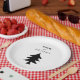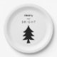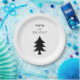 These modern holiday paper plates feature a black Christmas tree on a white background, and the words "Merry and Bright."