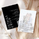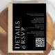 This design features a black and white modern, minimalist style, with a photo template, and elegant, simple, typography design, an all in one style, with details, and rsvp