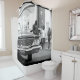 Black And White Monochrome Old Car People Walking City Life Cityscape Shower Curtain to add to your home / office / business decor collection. A cool gift / present idea for all who love industrial feel, custom design items.