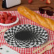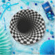A tunnel-like optical illusion is created using a black and white chequered pattern, giving a dizzying sense of depth