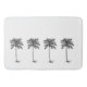 This modern coastal inspired bath mat features black palm palmetto trees on a background of solid white.