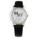 Destei's original cartoon illustration of a black and white coat colour Papillon breed dog. There is also a personalizable text area for a name. The clock face is made of simple black lines.