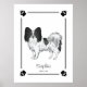 Destei's original cartoon illustration of a black and white coat colour Papillon breed dog. The design is surrounded by double lined borders that have a dog paw print in each corner. There are also two personalizable text areas under the dog image.