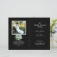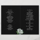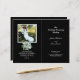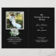 Black and white photo wedding program. A little bunch of white hydrangea flowers decorates the inside and back page beneath the picture template. Personalise all 4 sections with ceremony text, thank you message, or whatever you choose.