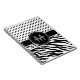 A monogrammed black and white notebook featuring polka dots on the top half and an animal print on the bottom half of the design. In the centre is your initial and name which is customisable.