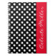 Chic, stylish and personal, this trendy notebook features black and white polka dots embellished with a contrasting red band and custom name. Add your name or other text by replacing the sample text shown in the design template. To change fonts, select the customise it button and make your changes. Other matching office products are available in this motif for a beautifully coordinated look. They make nice custom gifts for your friends, family and co-workers