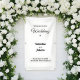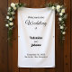 A banner in portrait orientation with black text on white background for couples seeking a classic and timeless color combination that can complement various wedding themes. It is also suitable for couples who prefer a text based design without background elements for readability. The black text contrasting on the white background also improves readability. The text is center aligned and the fonts used are calligraphy, script and sans serif. Calligraphy and script fonts are used to enhance the design while the sans serif font is used to enhance readability. Customize it by typing the names of the bride and groom, date and location of the wedding. You can also change the wording in the design tool including the font style, font color and background color. Please check the appearance after typing text. If the appearance is pleasing to you, you can place your order now. If you need to resize or reposition the text, please adjust in the design tool. A banner to welcome your guests. To the bride and groom, congratulations on your engagement! Wishing you both a lifetime filled with love and happiness.