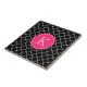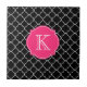 A black and white quatrefoil pattern has a hot pink single quatrefoil monogram frame to customise with your initial.