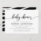 Stylish Baby Shower Invitation featuring the words "Baby Shower" in a relax cursive script in black against a white background. Card has a black back side featuring overlapping white lines.
