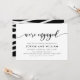Stylish Engagement Party Invitation featuring the words "We're Engaged" in a relax cursive script in black against a white background. Card has a black back side featuring overlapping white lines.