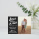 Photo save the date announcement featuring retro typography on a chalkboard background.