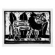 Abstract black and white design of a roaring lion baring his teeth, originally printed with the lino cut method.