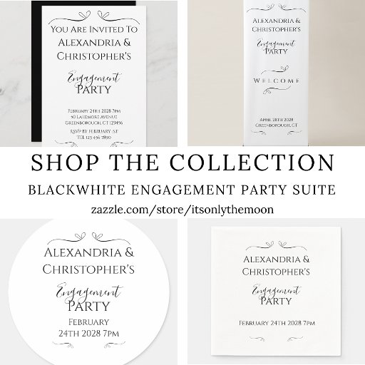 Minimal Black White Script Engagement Party SuiteDesigned by Only The Moon