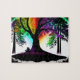 An abstract design with a sky adorned with a radiant spectrum of colours, while magnificent black and white tree silhouettes.
