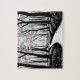 The design is a black and white drawing of a path in a forest. There is a small walking pathway through this forest where observers will notice purple abstract leaves hovering over the forest.