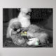 This photograph was digitally altered, making the background black and white, but leaving the three chicks in colour. The photo is of two silky chicken hens, one buff the other white as they lay together while watching over their newly hatched family of yellow baby chicks. Eager to see the world, two babies peer out from just above the brown mothers' wing another chick pokes out behind the mother leg. An adorable scene.