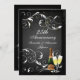 Elegant personalised anniversary party invitation for 25th or any year. Beautiful and festive invites feature black and white design with elegant swirling pattern and two glasses of bubbly champagne with green tinted bottle of champagne to celebrate the guests of honour's big day. Black and silver background with black and white swirls