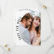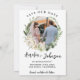 Elegant black and white photo minimalist wedding design with botanical wreath, simple and classy winter wedding save the date invitation. Great for modern classic wedding, vintage wedding and formal wedding. Explore full collection for matching items. Click the edit button to customise this design.The design features photo of couple in the front and botanical wreath at the back with photo