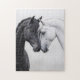 Jigsaw puzzle featuring two beautiful horses touching noses, one is white and the other is black. Perfect gift for horse lovers.