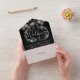 All in one wedding invitation featuring pretty string lights, hand-drawn floral garland and chic typography on a black background. The invitation includes a perforated RSVP card with your wedding website QR code and details. Designed by Thisisnotme©