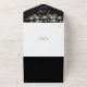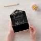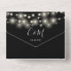 All in one wedding invitation with pretty string lights, signature style names and chic typography on a black background. The invitation includes a perforated RSVP card featuring a QR code. Designed by Thisisnotme©