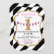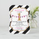 Bold black and white stripe print with birthday banner sign over a gold numeric one lettering and pink accents modern birthday invitation card design.