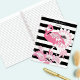 The product design features a flamingo with kaleidoscopic paisley patterns in shades of pink over black and white stripes background. This tropical bird design with personalised text makes a modern and unique notebook.