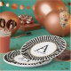 This paper plate features a black and white radial stripe around the edge with a white centre and a gold border. You can personalise with your last name and initial. Perfect for New Years Eve or any other formal gathering.