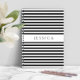 Spiral notebook featuring a personalised name print on a minimalist black and white striped pattern.
