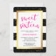 This stylish, elegant sweet 16 party invitation says "sweet sixteen" in modern, bright pink typography, and features black and white stripes with a faux gold frame and confetti. Easily personalise with all of the birthday girl's information.