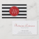 This chic & classy business card features a classic black and white horizontal striped background. On top of the background is a bright red decorative circle with a customisable white monogram. The back of the card is simple white with room for your name, job title & contact details. This is the ideal business cards for networking individuals, salons & spas, boutiques, makeup artists and fashion industry professionals.