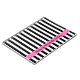 Personalised notebook featuring a pattern of black and white stripes. Across is a pink band with customisable text. Add a name or other text. Elegant, contemporary design for women.