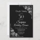 A black and white Surprise 30th birthday dinner invitation featuring ornate lace diagonal corners to frame the white text.