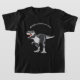 This boy’s tee shirt features a fearsome black and white T Rex Dinosaur on a black background.