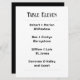 Black and white table number, guest seating idea. Seat wedding guests by listing names on a single table number card. White cards with black text and table number written out at the top. Text for names is a bold, printed font and it aligns to the top. Add spaces to support all the names. Double them up, such as Mr. and Mrs., or list separately. This example seats eight guests per table, but you could easily add more.