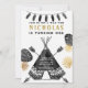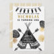 Modern, simple and bold- this design is perfect for your little adventurer's birthday party. Hand drawn teepee, arrows, feathers, and leaves with gold and black lettering. Perfect for your wild one!