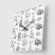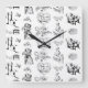 Black And White Toile Pattern Square Wall Clock, by Kristie Hubler, with rooster, ancient castle ruins, couple dancing, birds kissing, trees, birds nest with eggs for prosperity, leaves, floral bouquet, roses, a baby tossing a flower, and lambs