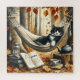 This cool animal graphic shows a black and white tuxedo cat sleeping in a hammock and dreaming of adventure. Next to this adorable kitty is an open book and in the background there are autumn forest trees.